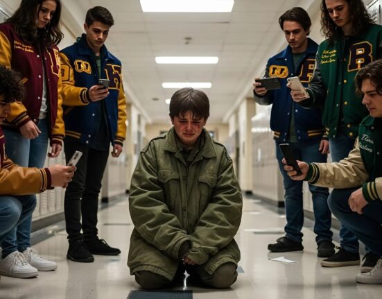 😨😲Os alunos riam alto do seu casaco gasto e grande demais, até que, de repente, um homem com insígnias de.