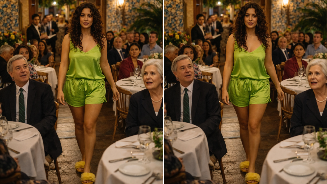 Naquela noite, o restaurante estava completamente cheio: risadas ecoando pelo salão, brindes se cruzando no