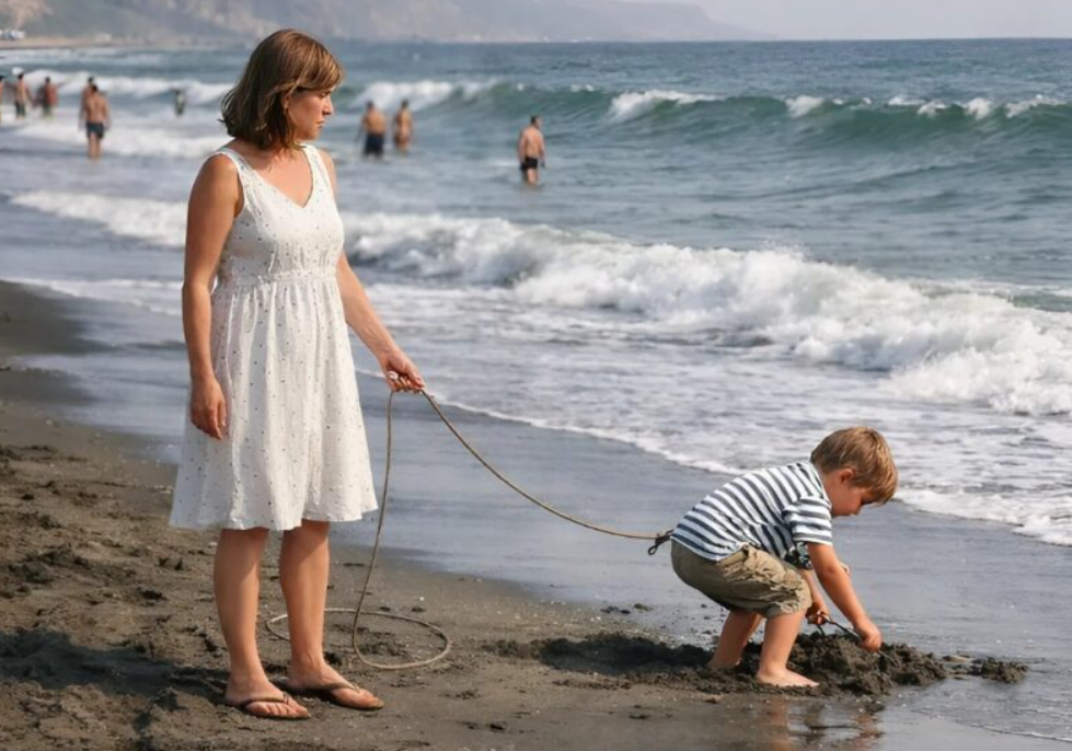 😮😮 Uma mulher levou um menino à praia preso a uma guia, como se fosse um filhote, e antes que.