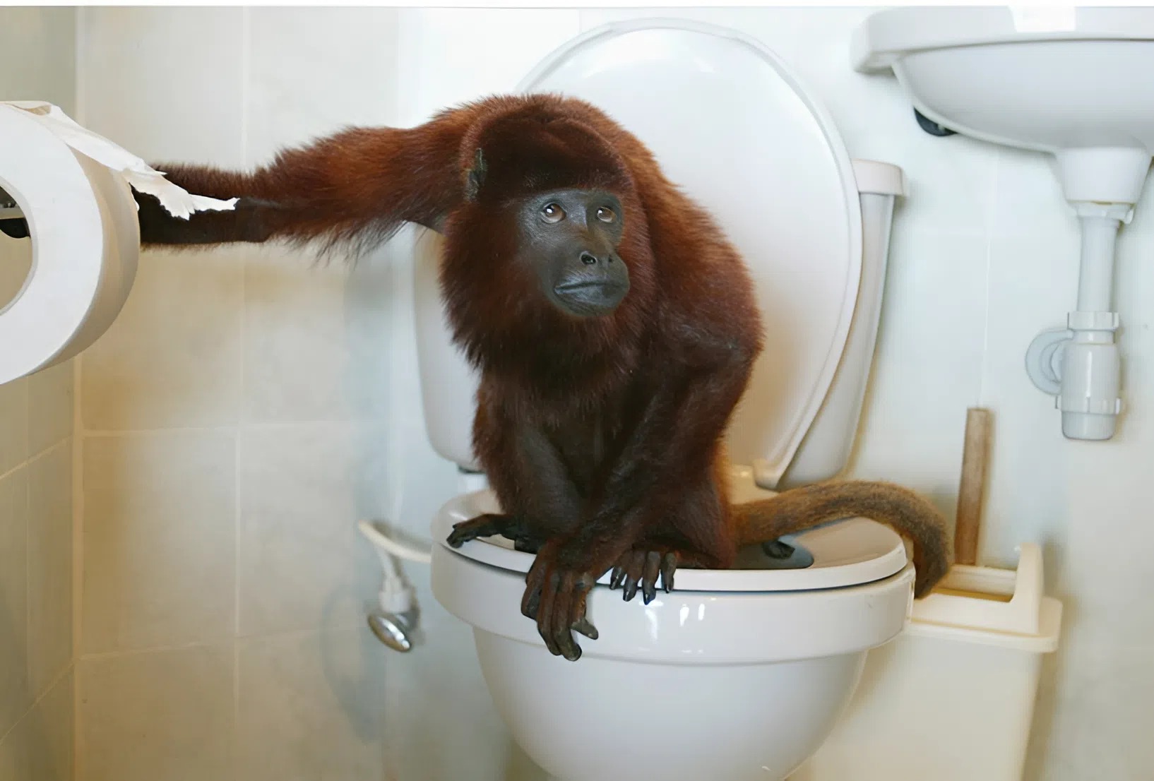 No vaso sanitário, sentadinho e confortável, estava… um macaquinho. Pequeno, peludo, com grandes olhos redondos cheios de surpresa — igual aos nossos. Ele nos olhava como se nós fôssemos os invasores, não ele.