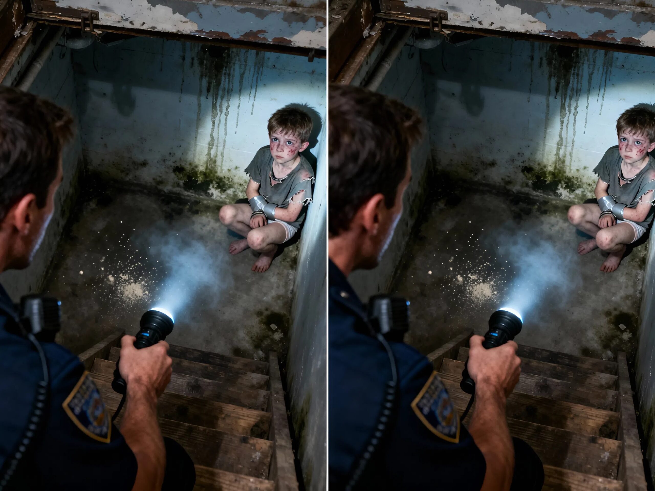 Na penumbra, minha lanterna recortou na escuridão a silhueta de uma criança. Ele não chorava, apenas tremia, como se estivesse preso entre o medo e a esperança.