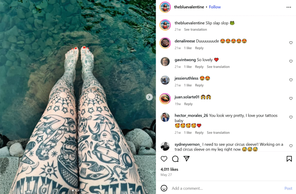 Cinco anos atrás, a blogueira chamada Blue Valentine fez sua primeira tatuagem — uma pequena flor na costela. Naquela época, ela tinha pavor de agulhas. Hoje, seu corpo é uma verdadeira galeria de 250 desenhos, e cada traço representa um novo capítulo de sua vida.