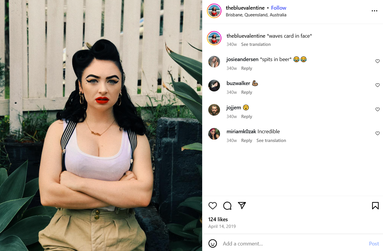 Blue chama o próprio corpo de “fantasia”. Sua pele é como um mapa, onde cada região tem um tema: lanchonetes retrô, circo, marinha, Velho Oeste. Tudo conectado por seu amor à estética dos anos 50, quando a feminilidade se misturava com rebeldia.