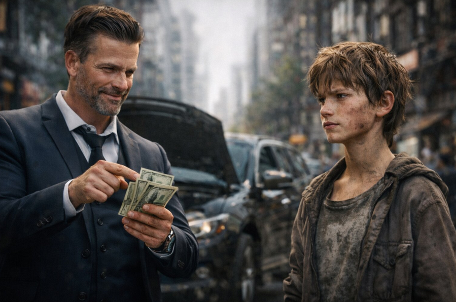 “Se você consertar o meu carro, eu te dou um milhão de dólares… e comida.” Ele zombou do garoto faminto na rua… mas a reação inesperada da criança fez o empresário empalidecer e se arrepender do que disse 😬