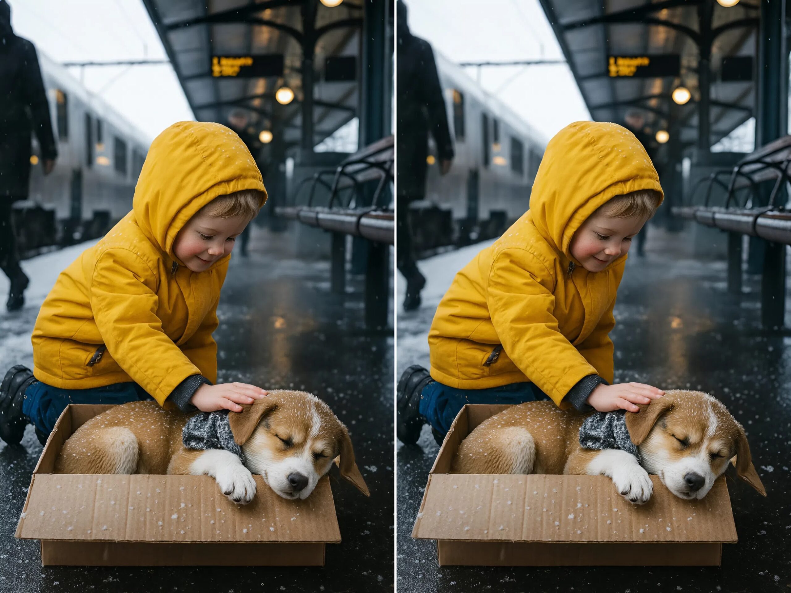Na plataforma coberta de neve, o menino de repente notou um cachorrinho encolhido dentro de uma caixa de papelão, como se tentasse se esconder do frio cruel.