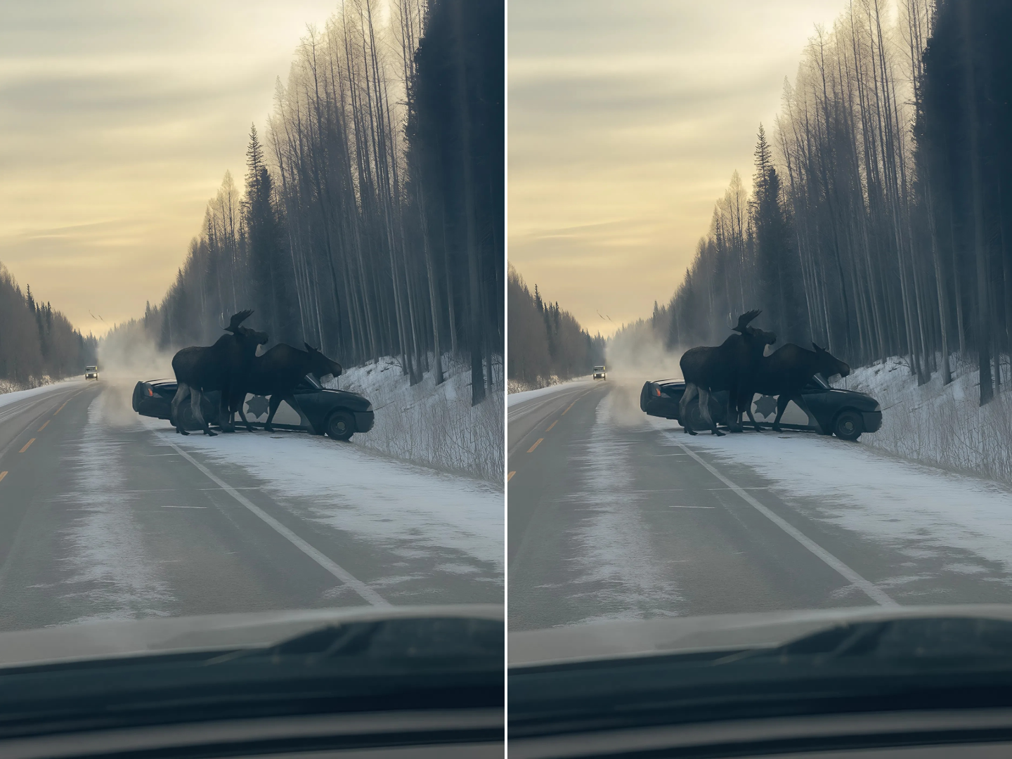 Na beira da estrada estava um carro da polícia, e ao redor dele — enormes cervos. Eles não apenas batiam com os cascos no capô — eles atacavam o carro com força, como se tentassem entrar.