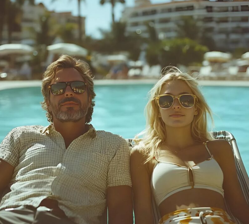 A poucos metros dali estava Rafael. E ele não estava sozinho — ao lado dele, deitada em uma toalha colorida, uma loira jovem de biquíni chamativo descansava a mão sobre a coxa dele com intimidade.