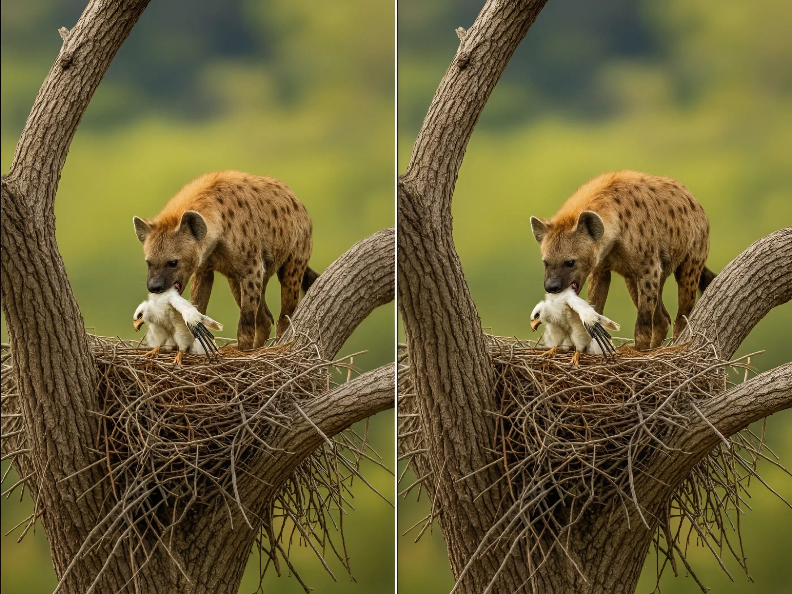 Quando a hiena, certa de encontrar o ninho desprotegido, subiu até ele, a águia desceu de cima de forma fulminante — sem dar chance de reação.